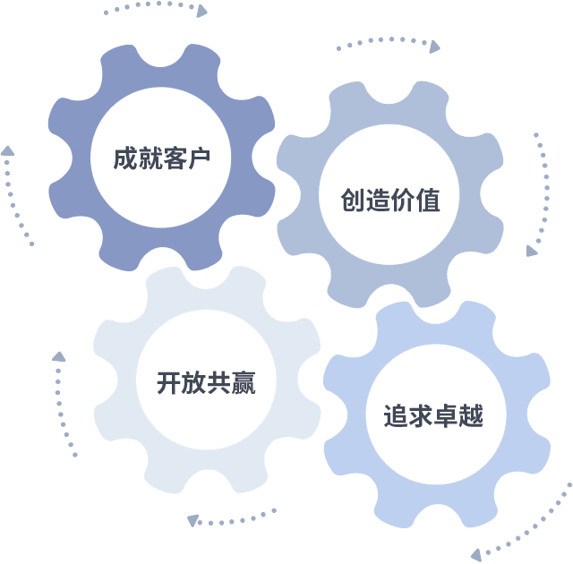 成就客户是一切决策的出发点,,,创造价值是衡量所有工作的标准,,追求卓越是我们做事做人的态度,,,开放共赢是我们的格局也是最终的结果。。。。价值观的齿轮环环相扣,,,推动着组织里的每个人不断向前。。